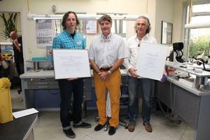 Michael Gottschalk ist nun schon über 40 Jahre und Jörg Röber 35 im Betrieb bei Kruchen Zahntechnik. Anlässlich der Feierlichkeiten zeichnete OM Dominik Kruchen Herrn Gottschalk mit der Silbernen Handwerksmedaille der HWK Düsseldorf aus.